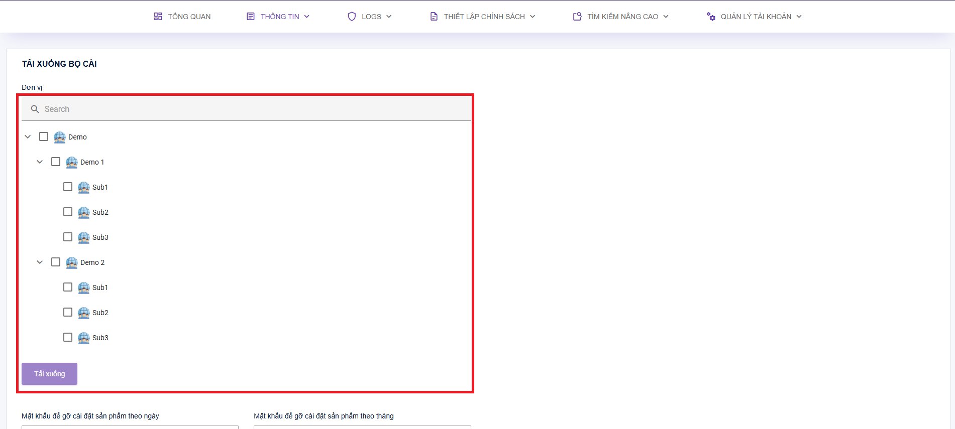 Chọn phần “Thông tin” → “Bộ cài” để chọn và tải xuống bộ cài ứng với khu vực, đơn vị và phòng ban.
